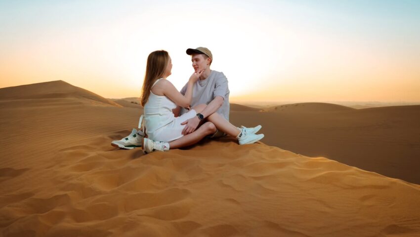 What can you expect from a romantic night in the desert? Below is a step-by-step breakdown of our curated “Sunset Romance” experience that is offered by the romantic Abu Dhabi Desert Safari.